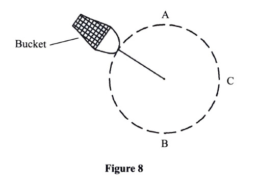 14. (a) Figure 8 shows a bucket full of water and tied to one end of the string which is used to whirl it in a vertical circular path with a uniform speed V