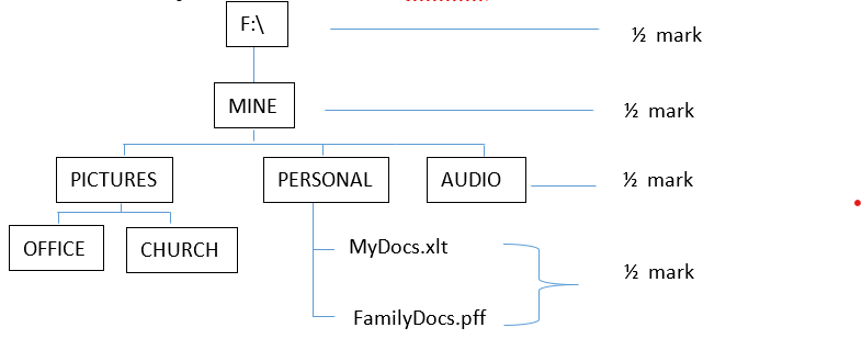 Lawino opened her flash disk in one of the school’s computers using drive F. she had saved her work in a folder named “MINE”. This folder has subfolders for PICTURES, PERSONAL and AUDIO. In PERSONAL subfolder, there are files such as MyDocs.xlt and FamilyDocs.pff, while in PICTURES there are subfolders such as OFFICE and CHURCH.