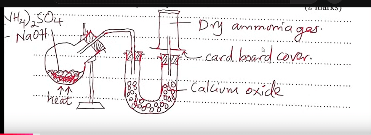 (b) Draw a well labelled diagram of a set - up of the apparatus that can be used to prepare and collect a sample of dry ammonia. (2 marks)