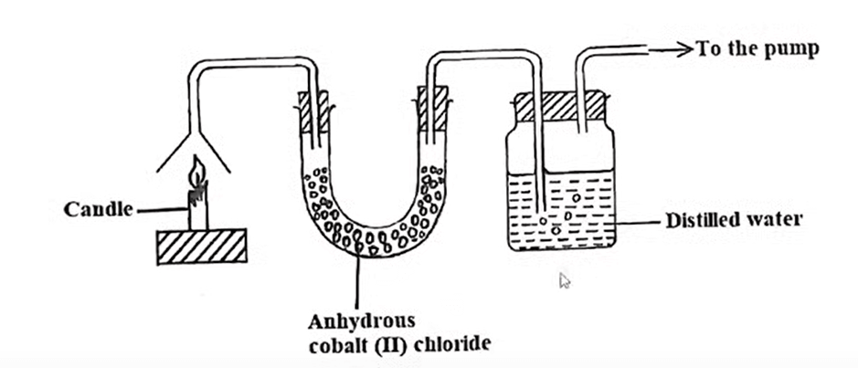 Explanation: Candle wax produces water and carbon (IV) oxide when it burns in air, water combines with blue anhydrous cobalt (II) chloride to form pink hydrated cobalt (II) chloride