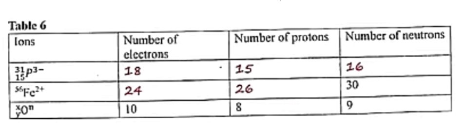 23. (a) Complete table 6 by filling the missing information for phosphorous and iron. (2 marks)
