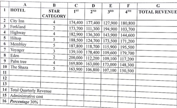 1.The management of a company owning a chain of hotels intends to use a spreadsheet to compute the revenues in thousands of Kenya shillings for the hotels during the first, second, third and fourth quarters. The hotels are rated as 2 star , 3 star , 4 star and 5 star.Figure 1 shows an extract of the worksheet