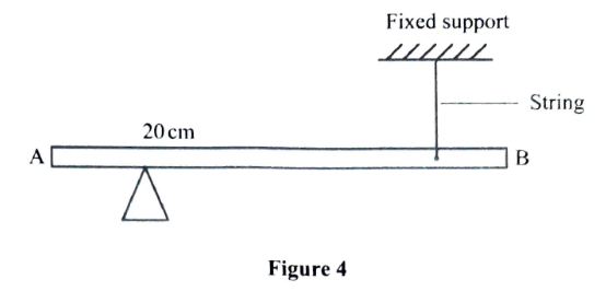 6. Figure 4 shows a uniform rod AB of length 1m and weigh 8N pivoted at 20cm from one end. It is balanced by supporting it with a string attached to a fixed support. The tension in the string is 4N. Determine the position of the string from end A