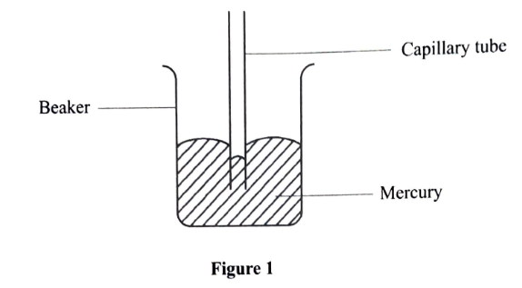 2. Figure 1 shows a capillary tube dipped in mercury in a beaker. State with a reason the observation that would be made on the level of mercury in the capillary tube if the temperature of the mercury is increased